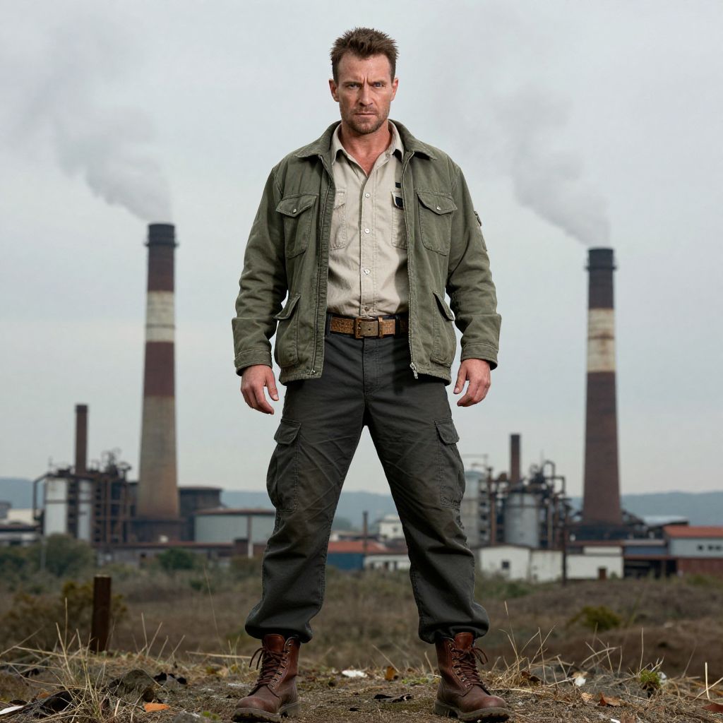 Photograph of a muscular, Caucasian man with short, spiky brown hair and a beard. He wears a green military-style jacket over a white button-up shirt, dark cargo pants with multiple pockets, and brown lace-up boots. He stands confidently with his hands by his sides on a grassy, slightly rocky terrain. In the background, there are two tall, industrial smokestacks emitting white smoke, with a large, complex factory structure between them under a cloudy sky. The overall mood is rugged and industrial.