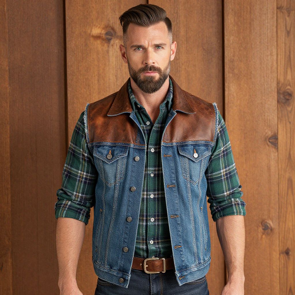 A confident man poses against a rustic wooden backdrop wearing a stylish denim vest with brown leather accents over a green plaid shirt. His rolled-up sleeves, well-groomed beard, and modern hairstyle complement the rugged, casual look inspired by classic western and country fashion styles.