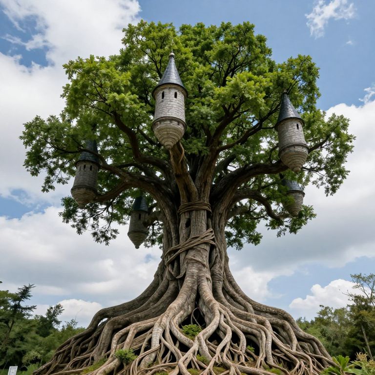 Castle perches majestically atop the sprawling roots of a colossal, verdant tree, its six gray-turreted towers seamlessly integrated into the gnarled branches that extend outward, creating a fantastical blend of nature and architecture under a serene, cloud-dotted sky.
