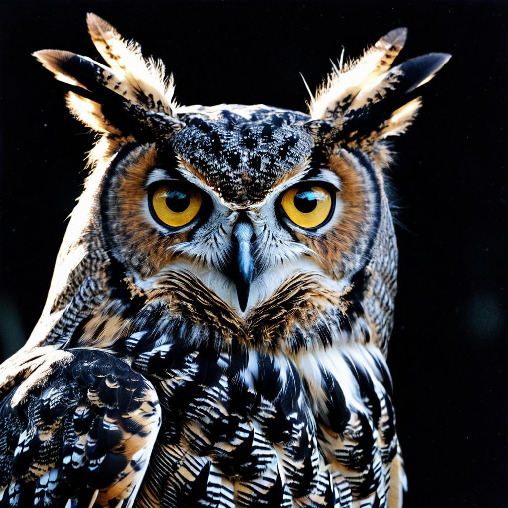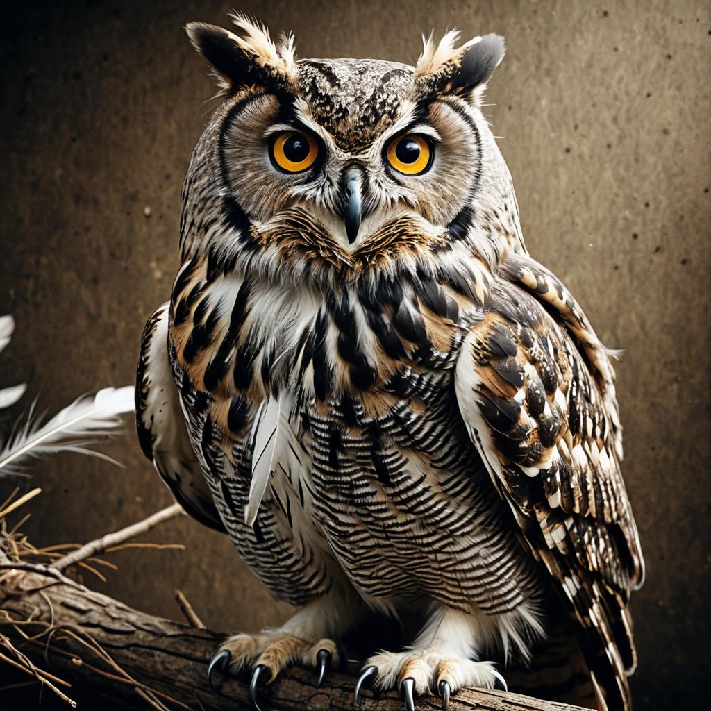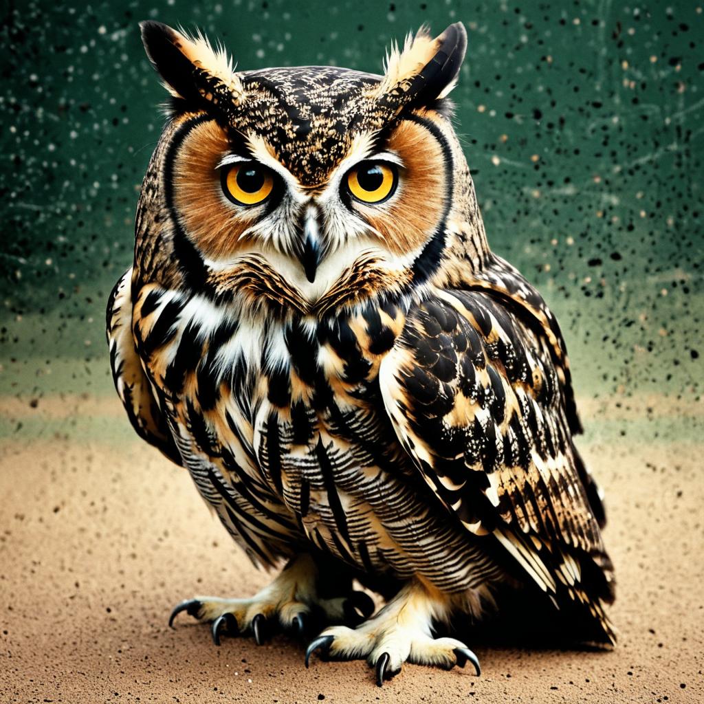 Great Horned Owl portrayed as the oracle of the night, with a majestic, regal aura that reflects mystery and insight.
