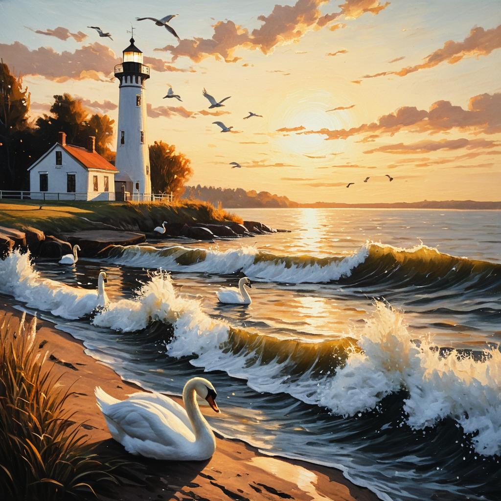 Serene oil painting of a secluded waterfall in a lush jungle at golden hour, mist swirling around, warm light from the lighthouse, subtle brushstrokes, calming ambiance.