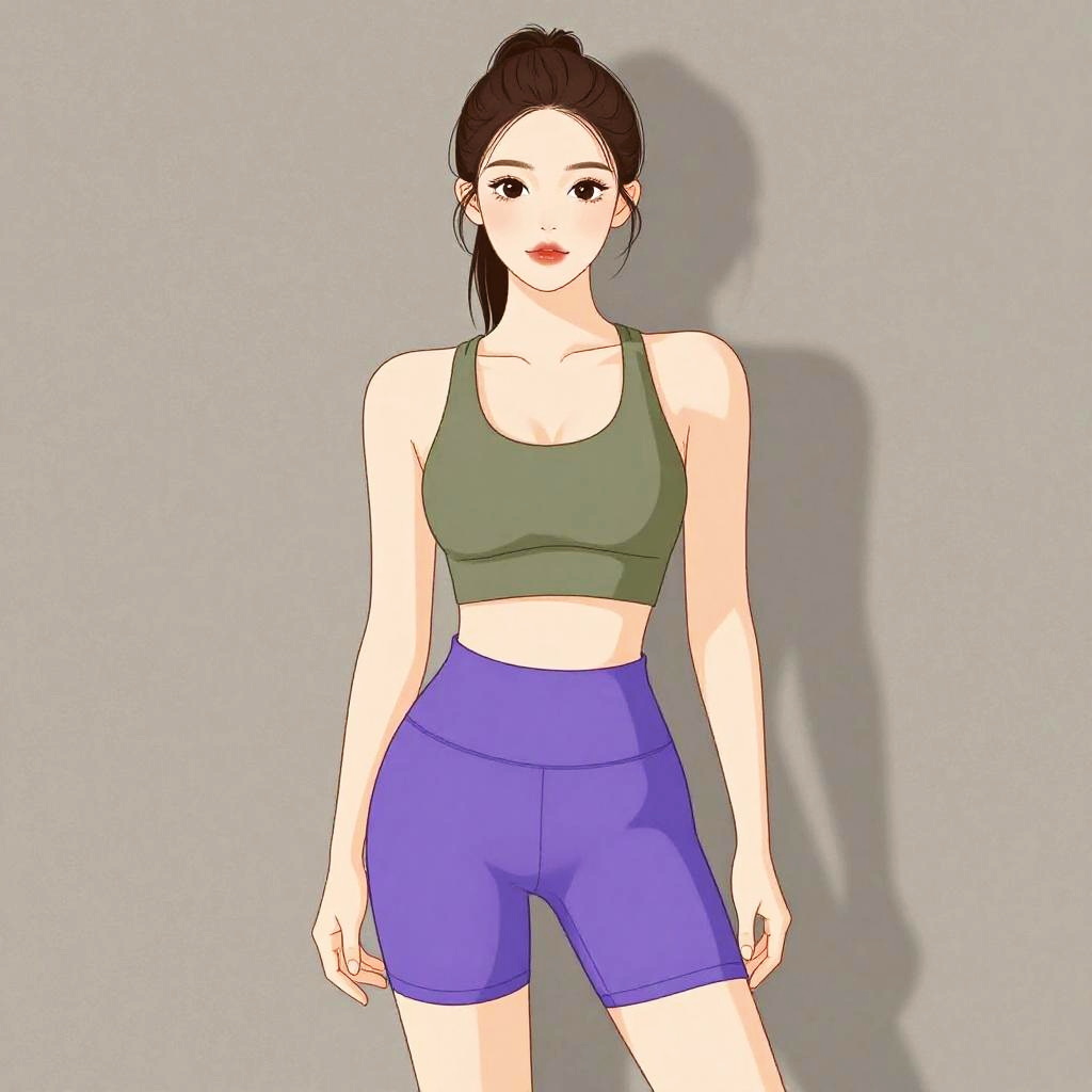 Woman with pretty face and pretty hair. Woman, athletic wear, olive green sports bra, scoop neckline, dual spaghetti straps, racerback style, matching high-waisted bike shorts, mid-thigh length, seamless construction, neutral indoor background with textured wall. --sref 1467