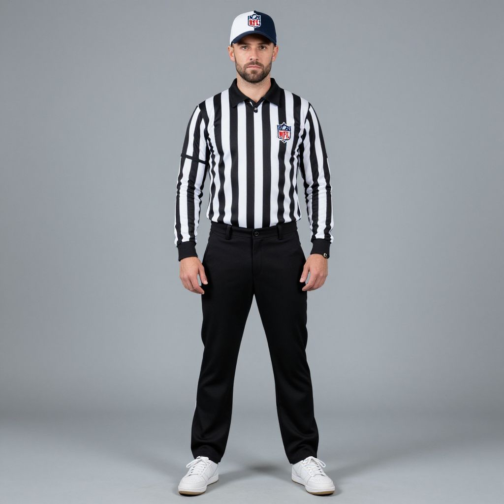 "nfl referee costume, 1boy, male focus, solo, striped shirt, hat, baseball cap, facial hair, full body, pants, shirt, shoes, sneakers, striped clothes, standing, beard, looking at viewer, vertical-striped shirt, grey background, long sleeves Realistic photo of casual sexy person with pretty face"