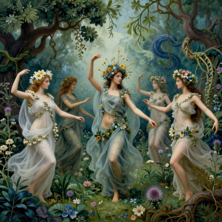 The image depicts a surreal, ethereal scene reminiscent of classical mythology and esoteric symbolism. Central to the composition are several female figures, each adorned with delicate flowers and draped in flowing, translucent garments that blend seamlessly with the surrounding flora. The figures appear to be in a state of ritualistic dance or ceremony, their postures and expressions conveying a sense of sacred initiation. The background is a lush, verdant landscape filled with an array of plants, including oaks, mistletoe, and thistles, as well as fantastical elements like vines, tentacles, and roots. The color palette is rich and varied, with shades of green, blue, and white dominating, creating a dreamlike atmosphere. The overall composition is balanced, with figures and flora arranged in a harmonious, almost symmetrical manner, suggesting a connection to nature and the divine. The scene evokes a sense of mystery and wonder, inviting the viewer to explore the deeper meanings and symbolism embedded within the image.