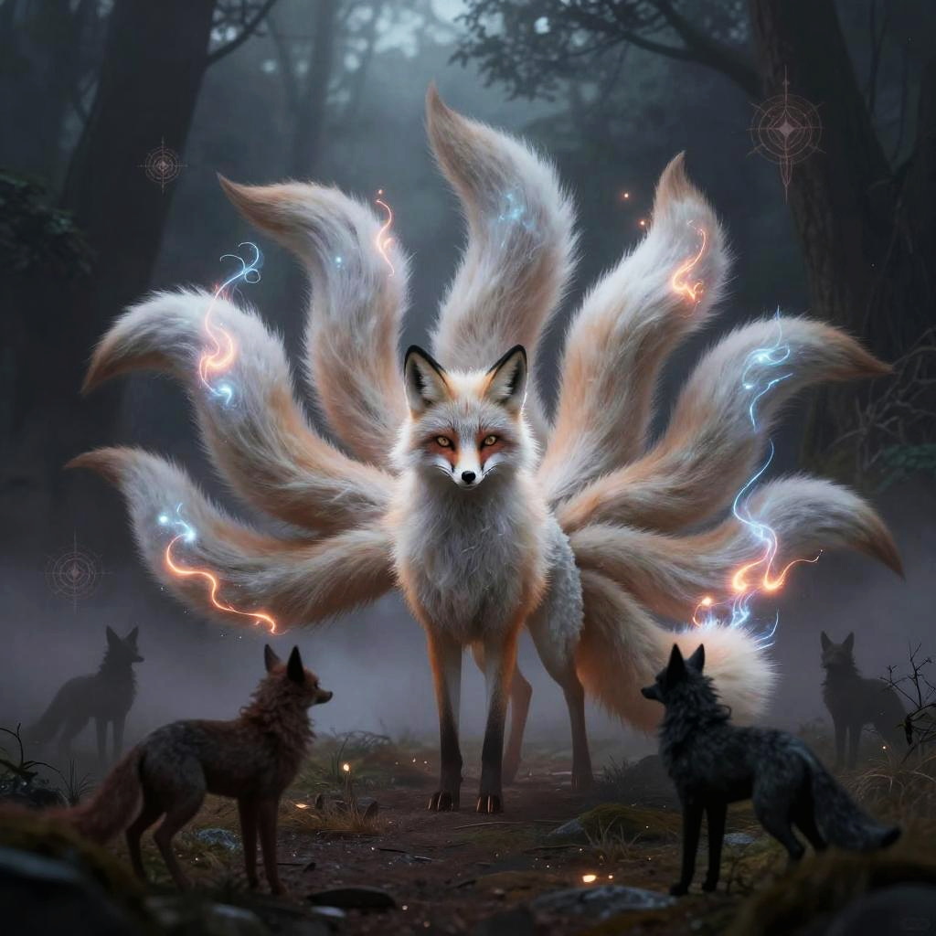 Kitsune abilities captured in a mysterious foggy landscape, a nine-tailed fox emitting ghostly foxfire, surrounded by enchanted animals and magical symbols, dark fantasy with glowing highlights.