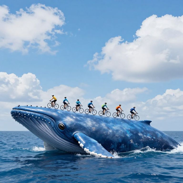 This digitally illustrated image depicts a massive blue whale with detailed textures, swimming in a vibrant blue ocean under a bright, cloud-speckled sky. On top of the whale, a row of seven cyclists, dressed in colorful, tight-fitting cycling gear, ride in a single-file line. The whale's large eye and textured skin, including white speckles, are prominently visible. The cyclists, each riding a modern road bike, are silhouetted against the bright blue sky and ocean. The overall style is realistic with a touch of surrealism, blending natural elements with an imaginative concept.