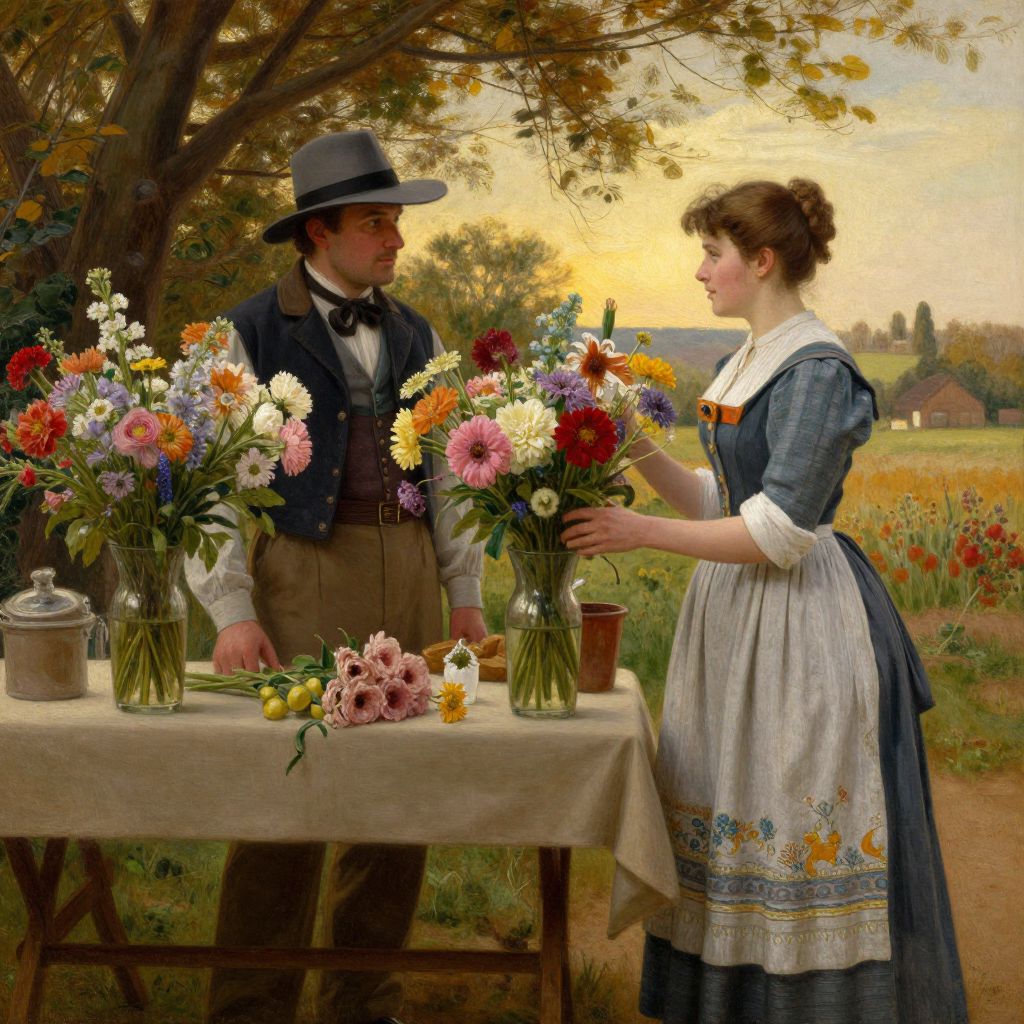 A Victorian-era oil painting by Victor Gabriel Gilbert depicts a rustic outdoor scene where a man in a wide-brimmed hat and traditional attire stands beside a table adorned with vibrant bouquets of flowers, while a woman in a detailed apron and dress carefully selects blooms, capturing the essence of rural charm and natural beauty through meticulous brushwork and warm, golden-hour lighting.