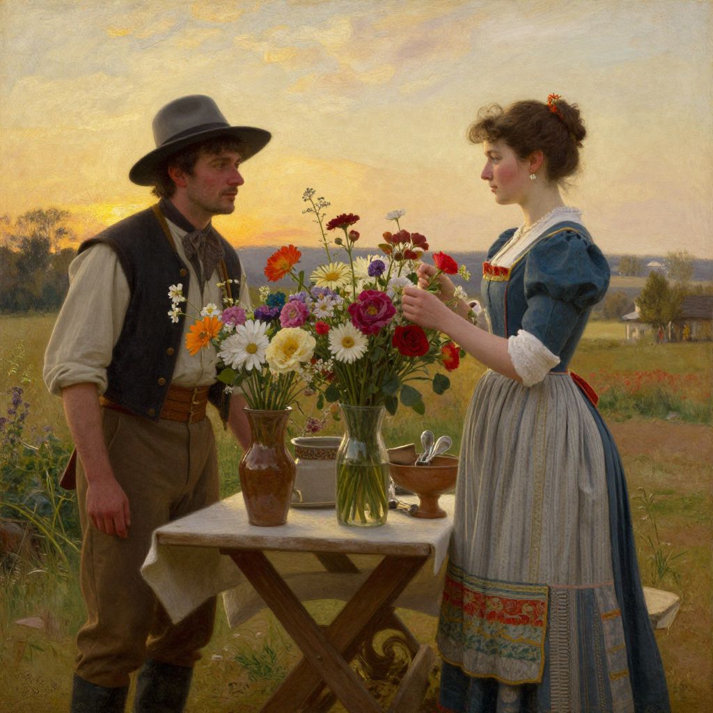 This is a detailed, realistic oil painting depicting a Victorian-era couple in a lush, sunlit meadow. The man, wearing a dark vest, bow tie, and grey hat, stands behind a wooden table adorned with vases of vibrant flowers, including daisies and chrysanthemums. The woman, dressed in a blue dress with a white apron featuring colorful embroidery, holds a bouquet, smiling at the man. The background shows a serene countryside with trees, a distant farmhouse, and a golden sunset. The table also holds a glass jar and a small, pink bouquet. The overall scene is romantic and pastoral.