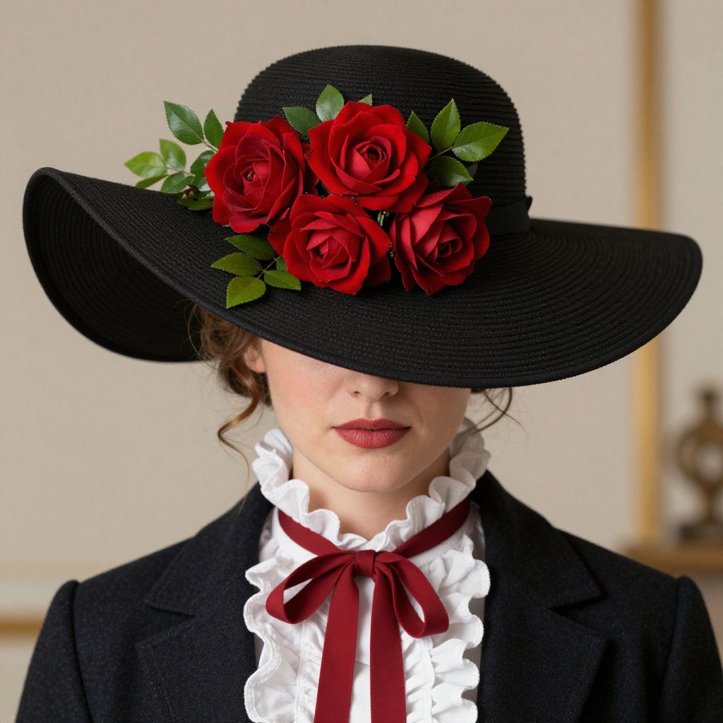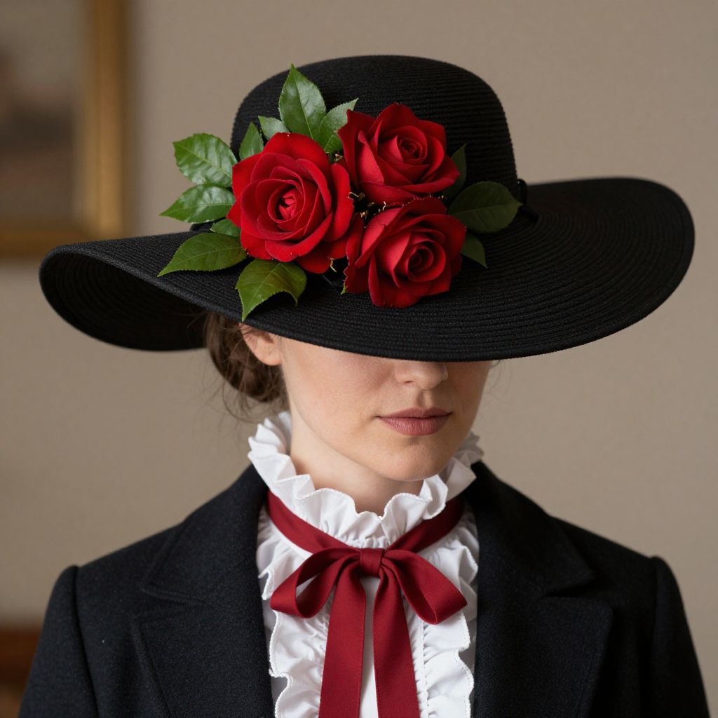 Elegant portrait of a woman wearing a wide-brimmed black hat adorned with three vibrant red roses and green foliage, complemented by a Victorian-style white ruffled collar and a dark jacket with a red ribbon tie, set against a softly lit indoor background.