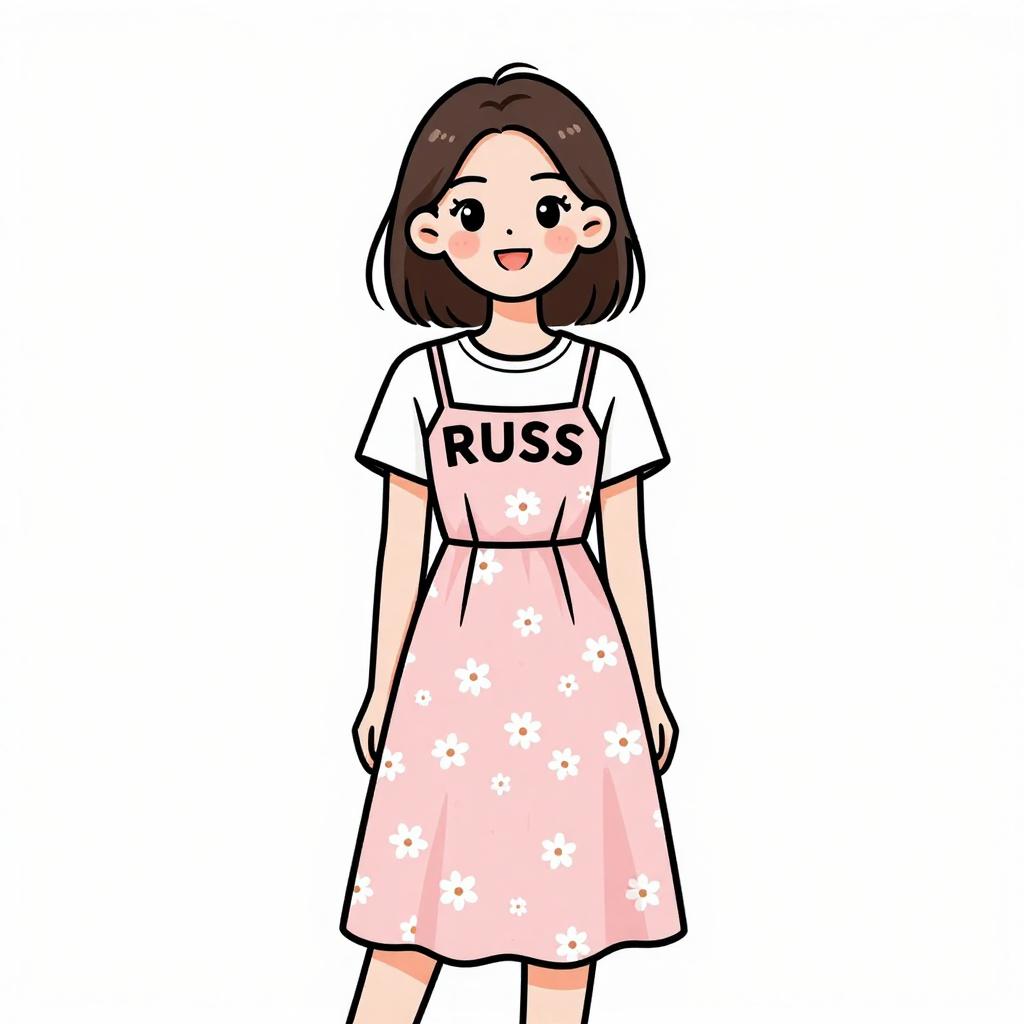Cartoon-style digital drawing of a smiling young woman with short brown hair, wearing a white t-shirt with "RUS" and a pink floral dress