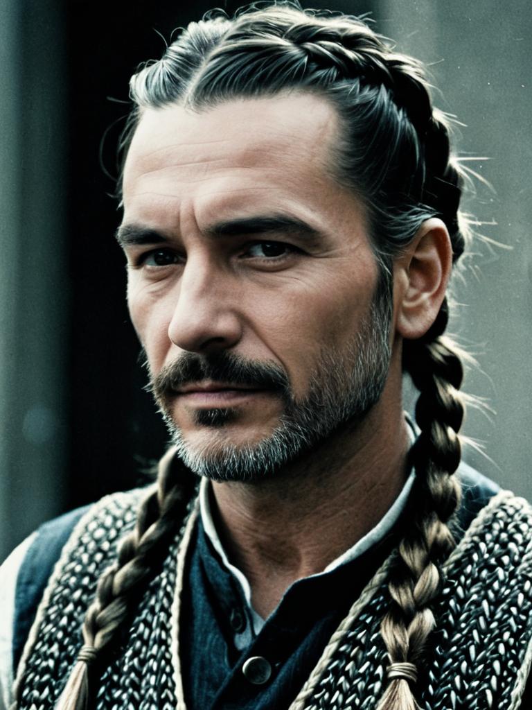 Man in Braided Hairstyle costume, cinematic realism, sharp portrait detail