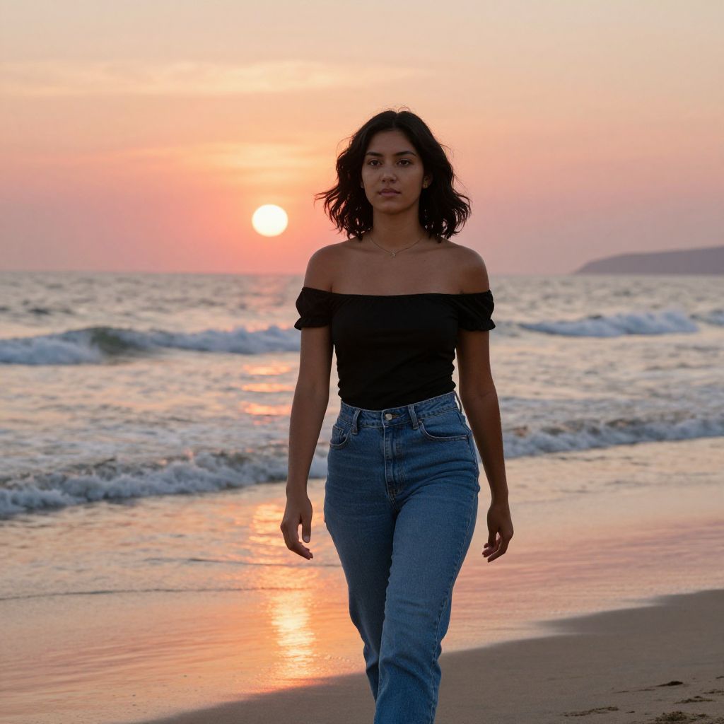 Against the boundless expanse of sea and sky, a young woman stands in quiet contemplation, her vibrant attire a testament to the enduring spirit of freedom, while the gentle whisper of waves and the warmth of the sun evoke a profound sense of serenity and timeless beauty.