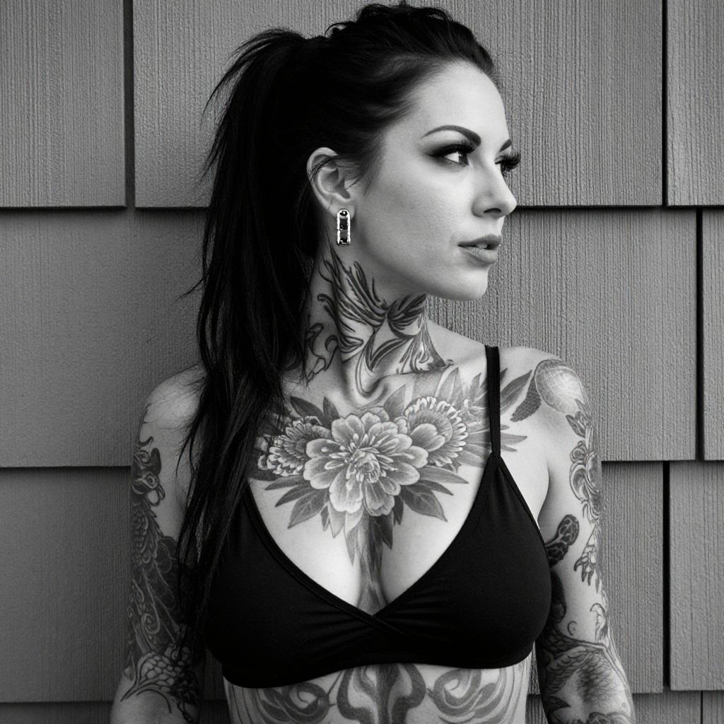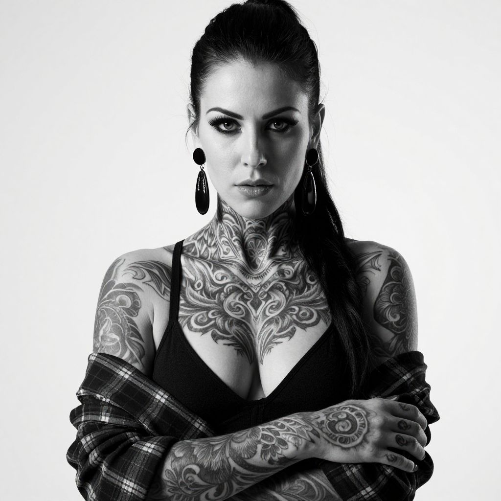 Photograph of a tattooed, dark-haired woman with piercing, wearing an unbuttoned plaid shirt, showcasing intricate chest and neck tattoos, against