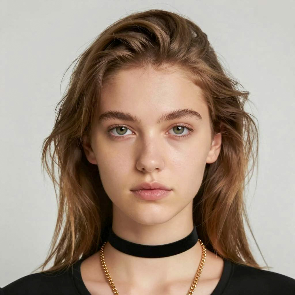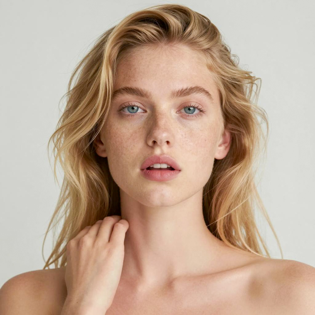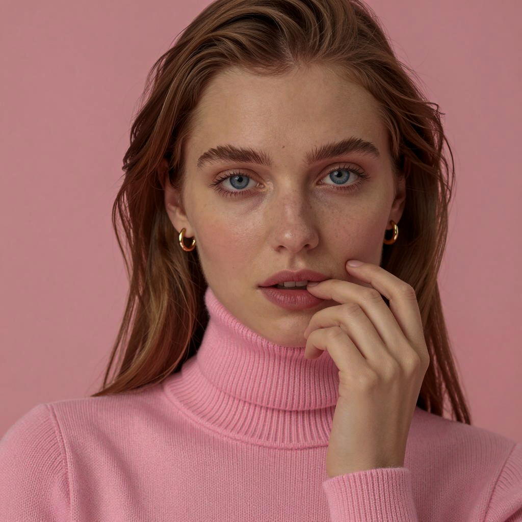 Photograph of a young woman with light brown wavy hair, blue eyes, and full pink lips. She wears a high-collared black satin top. The background is split into bright blue and pink. Her facial expression is neutral and intense. Her skin is smooth and glowing. She is the central subject, facing the camera directly.