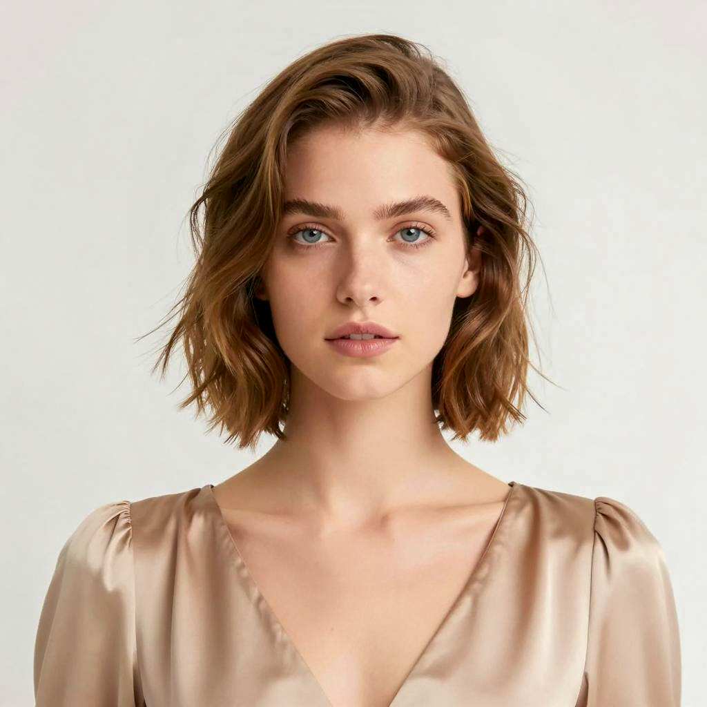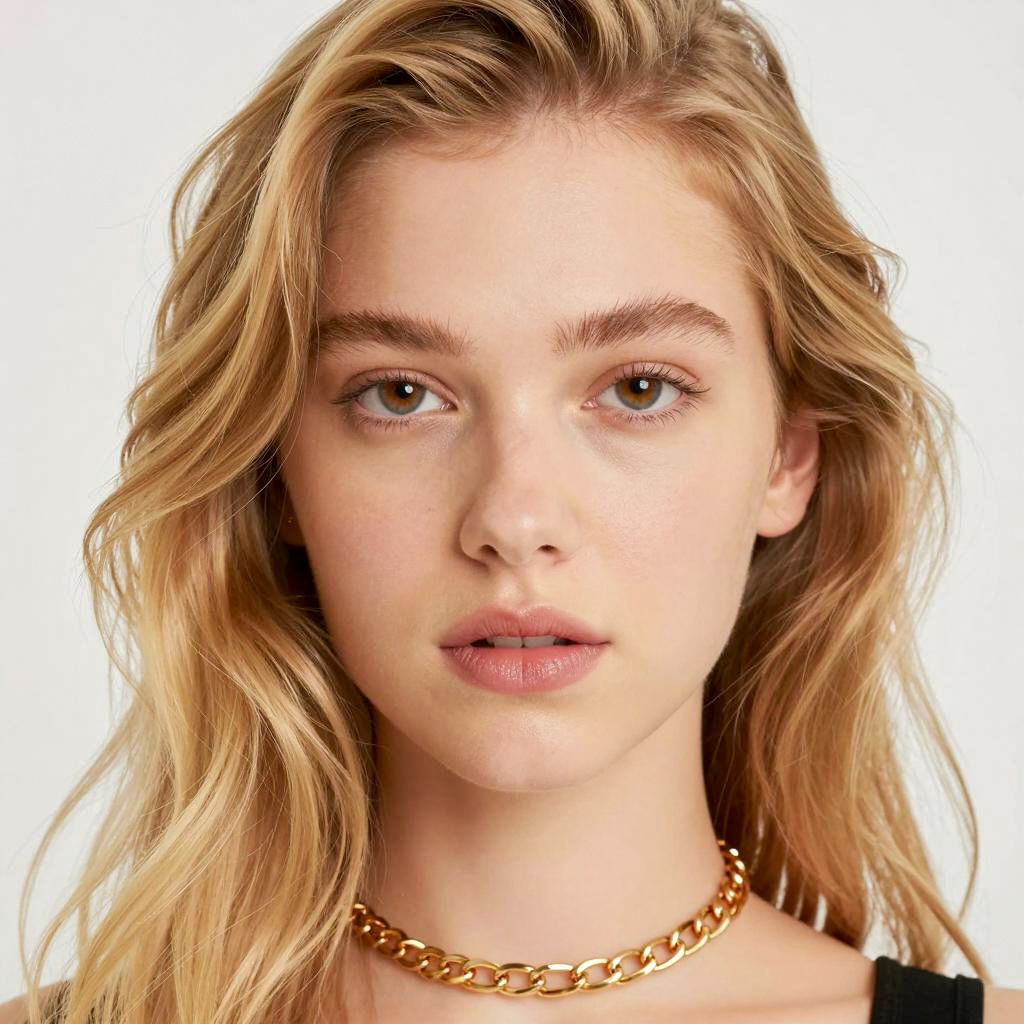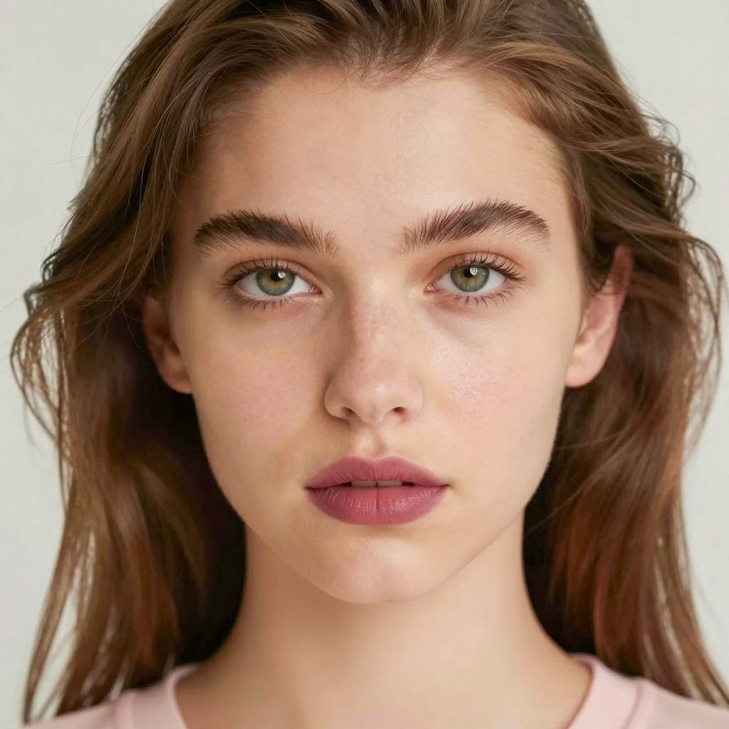 Photograph of a young woman with light brown wavy hair, blue eyes, and full pink lips. She wears a high-collared black satin top. The background is split into bright blue and pink. Her facial expression is neutral and intense. Her skin is smooth and glowing. She is the central subject, facing the camera directly.