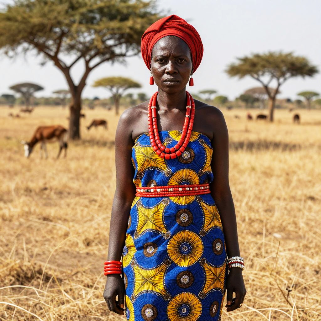 Photograph of a serious African woman standing in a sunlit savanna. She wears a vibrant blue and yellow patterned dress with intricate designs, layered with red bead necklaces and matching red headwrap. She also has red bead earrings and bracelets. The background shows dry grass and blurred acacia trees, with a few animals grazing in the distance. The lighting highlights her dark skin and colorful attire.
