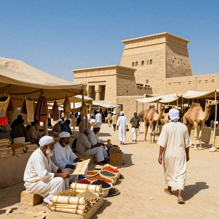 Photograph of a bustling outdoor market in an ancient desert oasis. Men in traditional white robes and white head coverings sit under beige canopies, selling goods like nuts and spices in woven baskets. The background features a large, rectangular stone building with a flat roof and small windows, reminiscent of ancient Egyptian architecture. Camels are walked around the market area, and the bright blue sky contrasts with the sandy terrain. The image captures the vibrant, cultural atmosphere with a clear, sunny day enhancing the colors and textures.