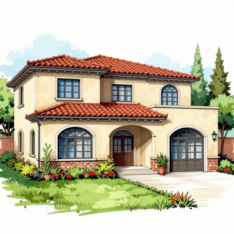 A hand-drawn architectural illustration showcases a Mediterranean-style home with a warm beige facade, red-tiled roof, and arched windows, complemented by lush greenery and vibrant landscaping, rendered in a detailed, high-definition sketch style.
