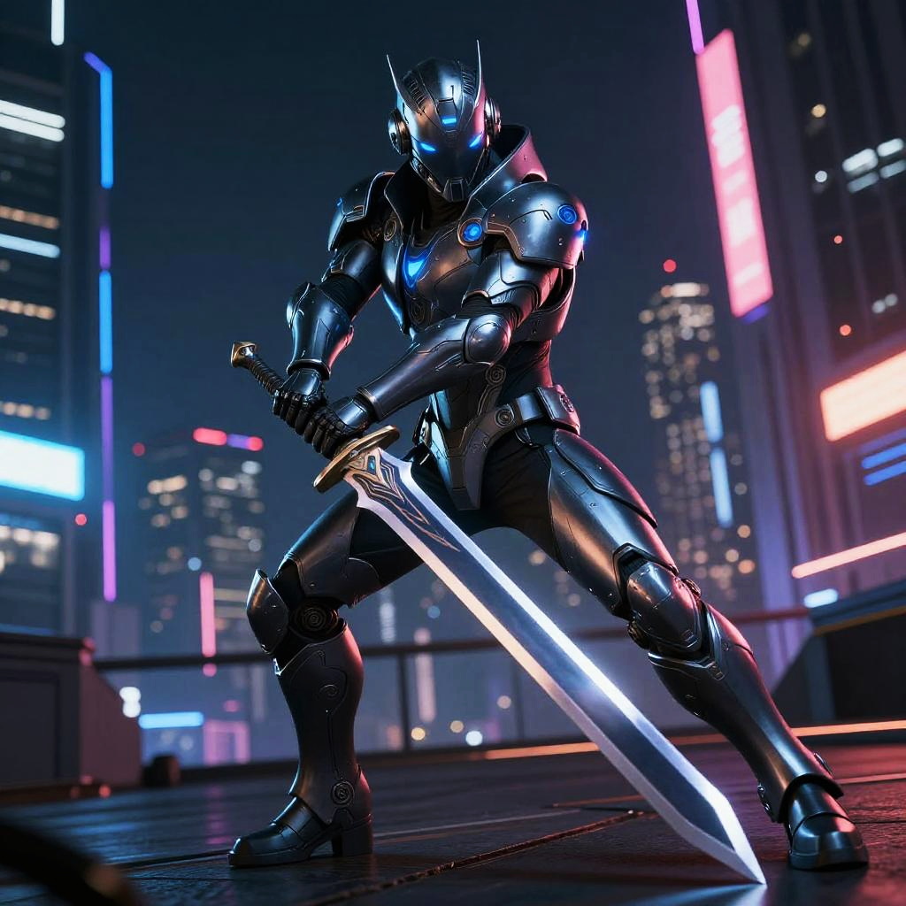 Sword wielding poses of a futuristic cyberpunk swordsman, neon cityscape at night, sleek armor with glowing blue accents, dynamic movement, high contrast lighting, sci-fi vibes
