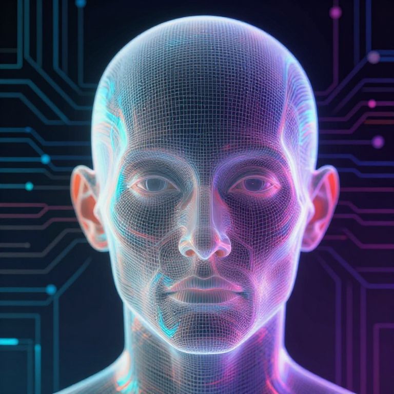 Digital CGI of a bald, transparent, grid-patterned human face with neon blue, pink, and purple hues against a dark circuit board background.