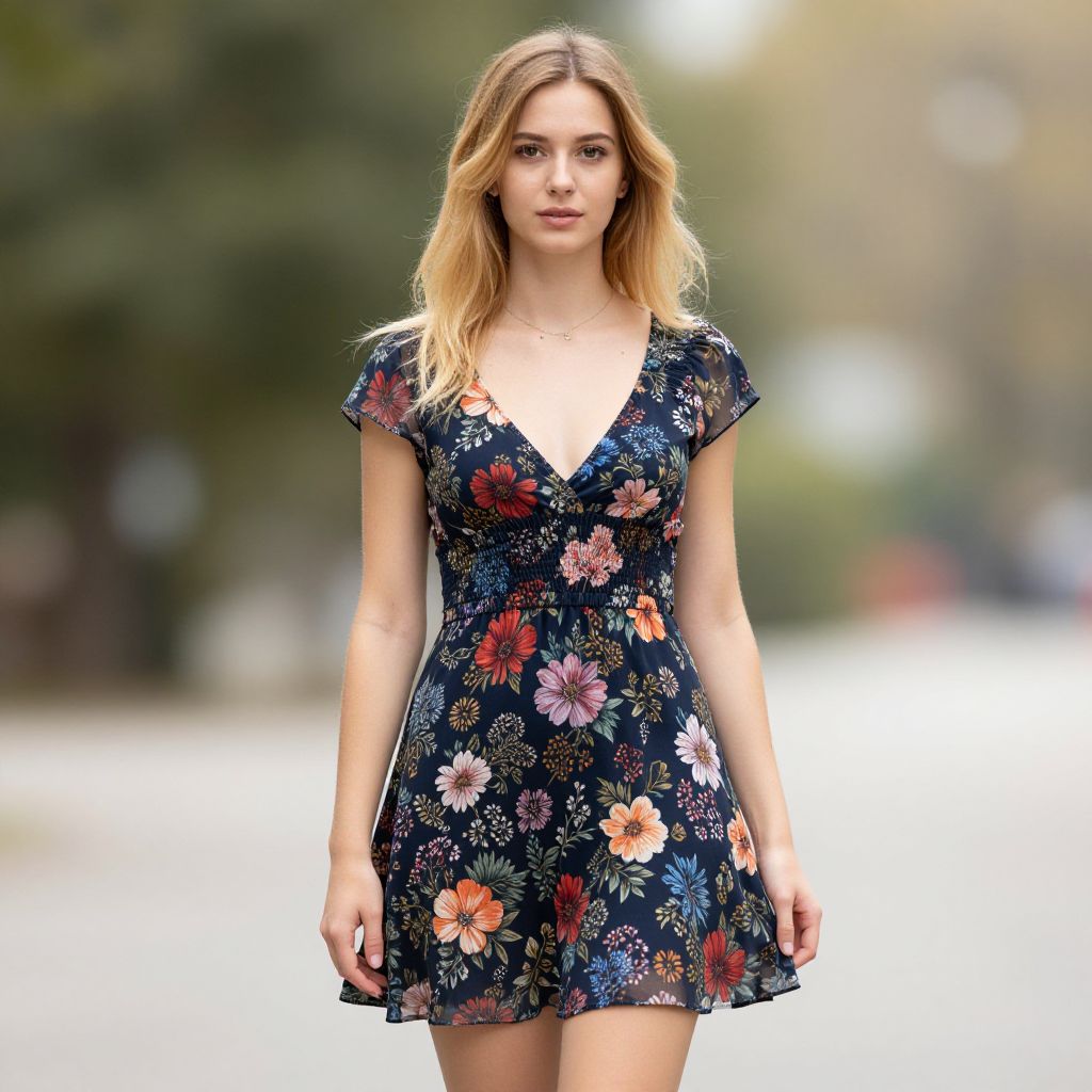 Photograph of a young Caucasian woman with long, wavy blonde hair and fair skin. She wears a dark blue, V-neck, short-sleeve floral dress with vibrant flowers in shades of pink, orange, and red. The dress has a slightly flared skirt. She stands in a blurred outdoor setting with greenery in the background. Her expression is neutral, and she has a slender build. The lighting is natural, highlighting her features and the dress's vivid colors. The overall style is casual and feminine.