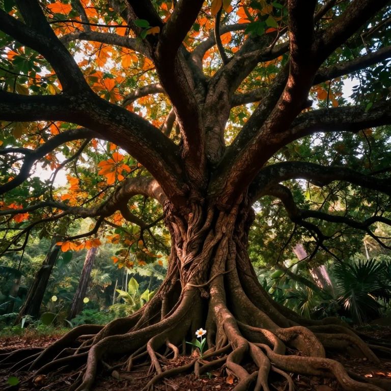 A large, ancient tree with a massive, twisted trunk and sprawling roots dominates a forest scene. The tree's bark is deeply textured with intricate patterns, while its branches extend widely, covered in vibrant orange and green leaves. Sunlight filters through the foliage, creating a warm dappled light pattern on the forest floor. At the base of this majestic tree, a delicate white flower blooms, contrasting with the strong roots. The surrounding environment is lush and dense, emphasizing an enchanted forest atmosphere.