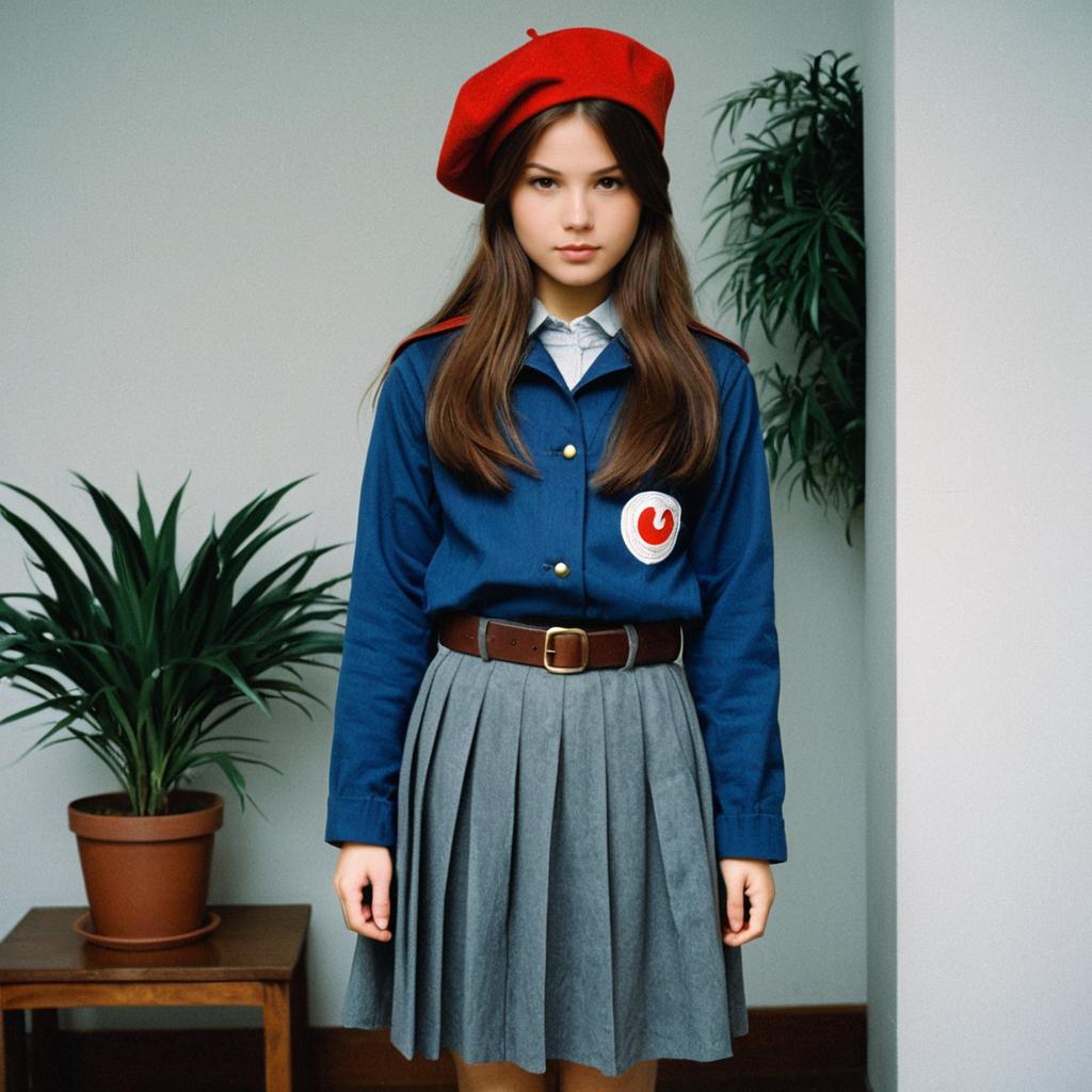 Kikis delivery kiki costume,1girl, solo, skirt, belt, hat, red headwear, brown hair, grey skirt, long hair, looking at viewer, shirt, plant, standing, indoors, long sleeves, long skirt, closed mouth, arms at sides, jacket