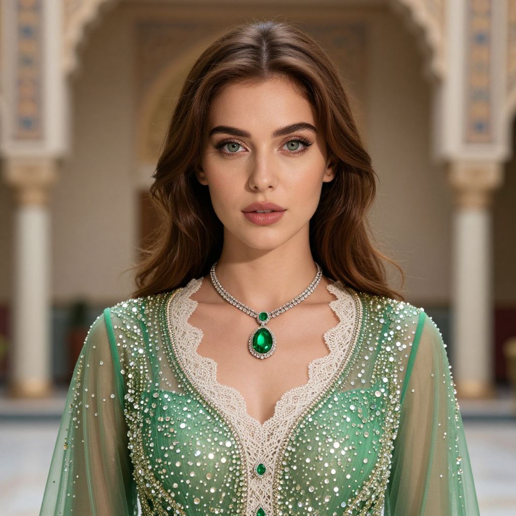 The image features an incredibly beautiful woman with light green eyes and long brown hair, exuding an ethereal and regal presence. She is adorned in a stunning green transparent dress, scattered with sparkling crystals that catch the light, adding a touch of elegance and sophistication. Her attire is complemented by a delicate white lace collar, which frames her neck and shoulders, enhancing her graceful appearance. A striking green gemstone necklace rests at the center of her chest, drawing attention to her refined and regal demeanor. The background, though blurred, suggests an Arab palace with intricate architectural details, providing a fitting backdrop for her regal appearance. The overall composition is harmonious, with the woman's attire and the palace's architecture complementing each other, creating a visually captivating scene.