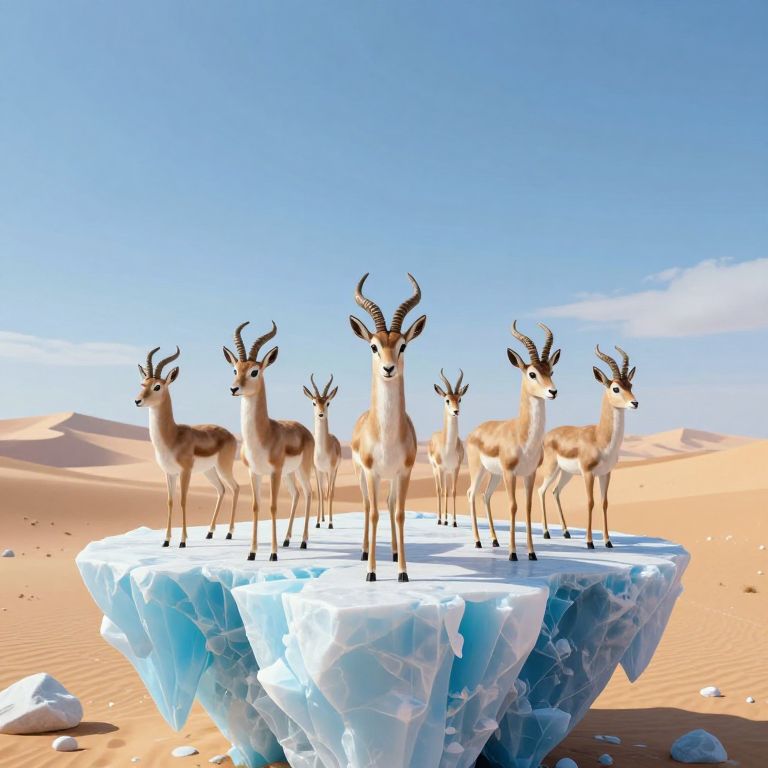A surreal 3D-rendered scene depicts a group of antelope-like creatures standing solemnly on a floating iceberg amidst a stark desert landscape, blending digital artistry with a dreamlike, otherworldly aesthetic.