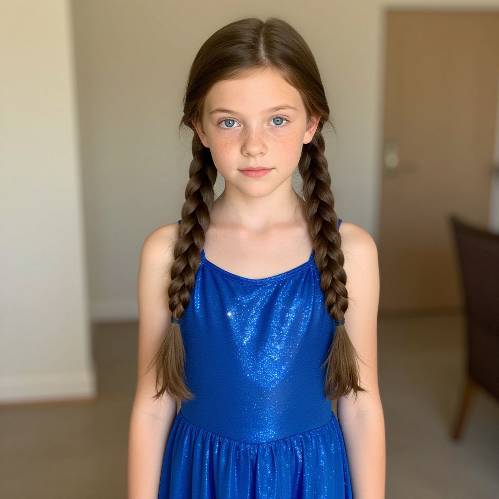 Photograph of a young girl with fair skin and blue eyes, wearing a sparkly blue dress with twin braids, standing in a softly lit,