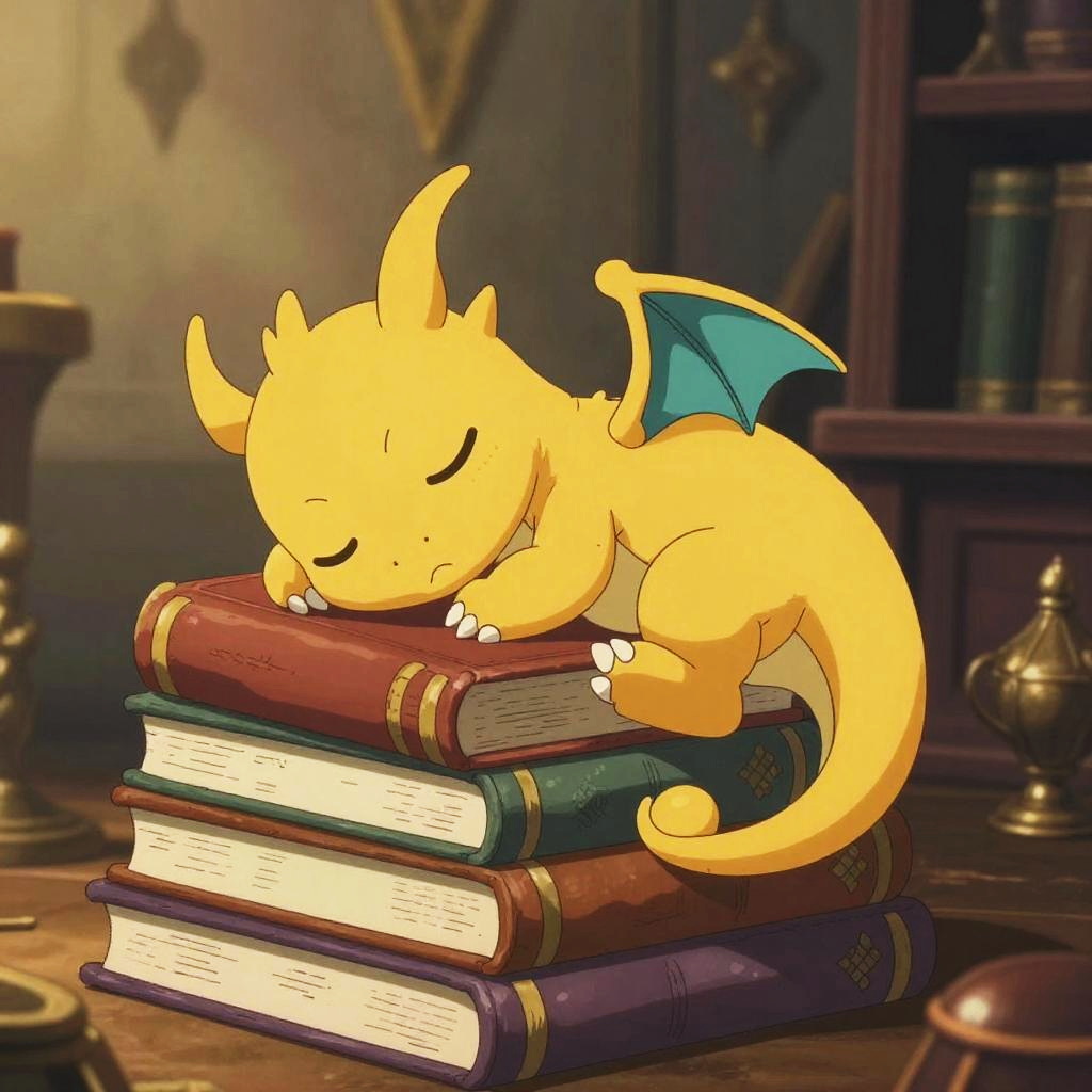 Digital illustration of a cute, yellow, baby Charizard with small blue wings, closed eyes, and a content expression, sleeping on a stack of three thick, colorful books with red, green, and blue covers. The background features a dimly lit, cozy library with wooden shelves, brass candlesticks, and ornate decorations. The Charizard's small claws rest gently on the books, and its tail curls around them. The overall style is whimsical and warm, with soft lighting and gentle shadows enhancing the peaceful atmosphere.
