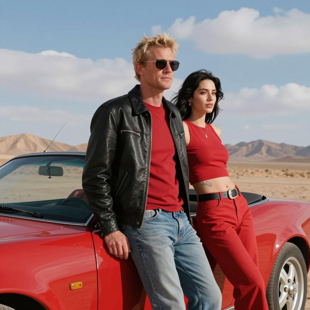 Photograph of two people standing next to a red classic car in a desert landscape with a cloudy sky. The man with blonde hair in a leather jacket and red shirt leans slightly, smiling. The woman with dark hair, wearing sunglasses, a pink crop top, and pants, leans against him, eyes closed. The car is parked on a flat sandy area with hills in the background. The man's right hand rests on the car, and the woman's left hand is on her hip.