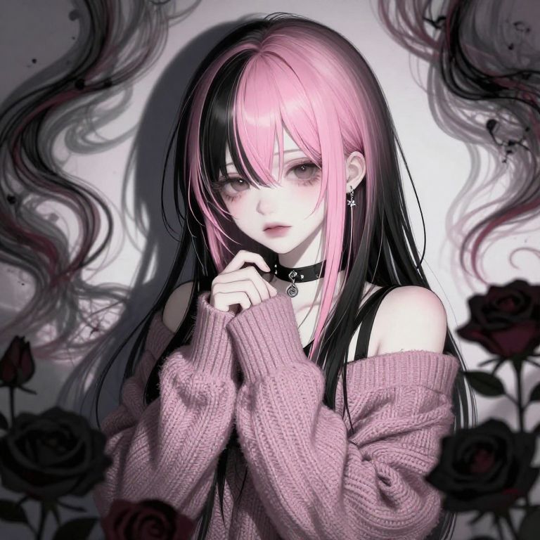 Digital anime-style drawing of a pale, pink-and-black-haired girl with black choker, pink sweater, and black dress, surrounded by black roses and