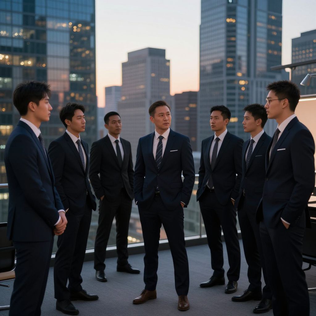 Photograph of seven East Asian men in dark suits and ties standing on a rooftop terrace at sunset, facing each other. They have short, black hair and wear glasses; one man in the center has hands in pockets. Background features a cityscape with tall, illuminated skyscrapers. The men's expressions are serious, with one looking slightly to the side. The rooftop has a glass railing, and the lighting creates a blue twilight ambiance. The men's suits are well-fitted, and their shoes are polished. The overall mood is professional and formal.