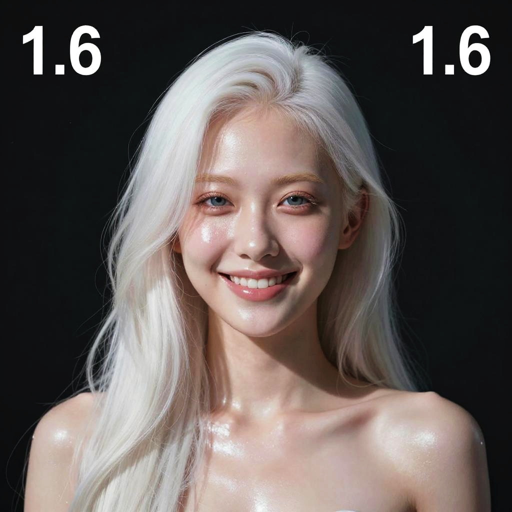 Photorealistic digital portrait of a smiling young woman with long, shiny white hair, fair skin, and blue eyes, against a black background with "