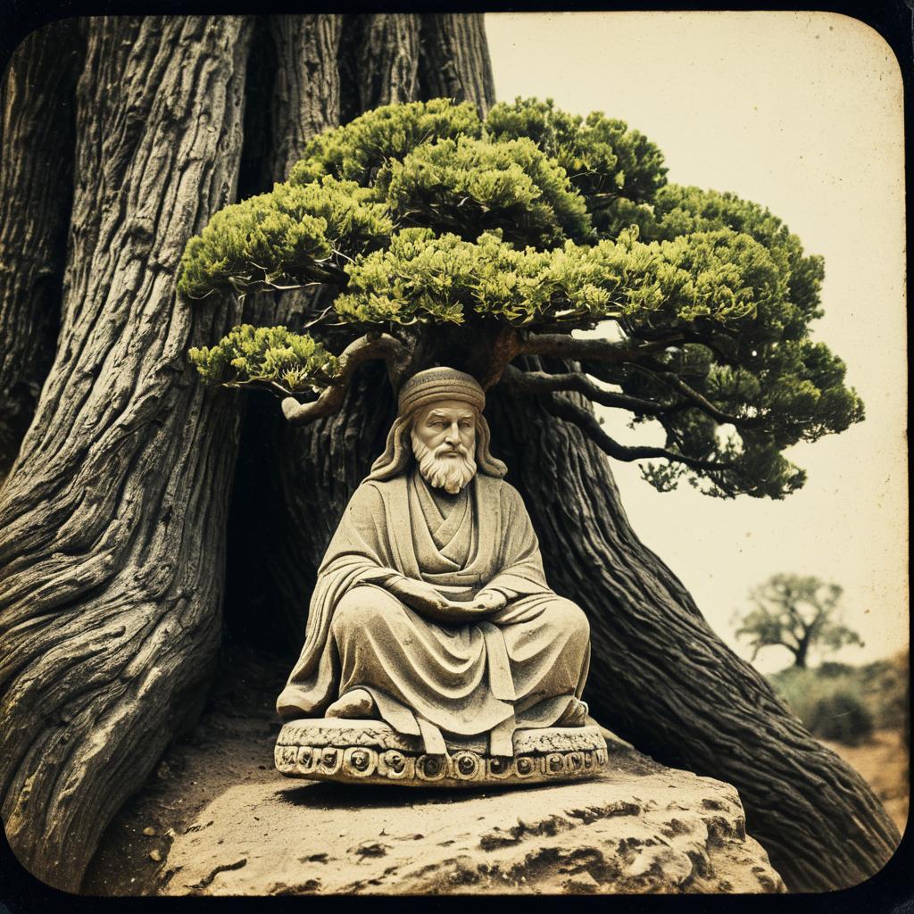 A small sandstone statue depicting a wise ancient figure seated with draped robes and a head covering, placed beneath a lush bonsai tree with dense, intricately detailed green foliage. The statue sits on a carved stone base in front of a rough textured, large tree trunk. The photo has a vintage daguerreotype style with soft neutral tan and green tones, grainy texture, and vibrant but muted colors, contributing to a nostalgic atmosphere.