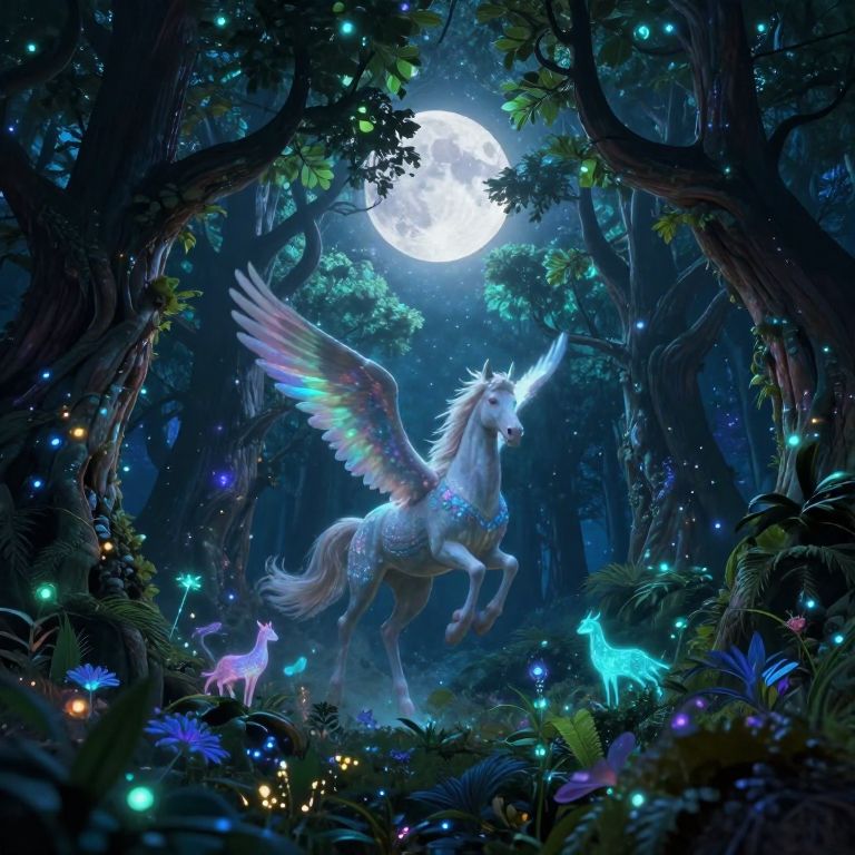 Digital fantasy artwork of a glowing white unicorn with rainbow wings, standing under a full moon in a magical, luminescent forest. Surrounding it are