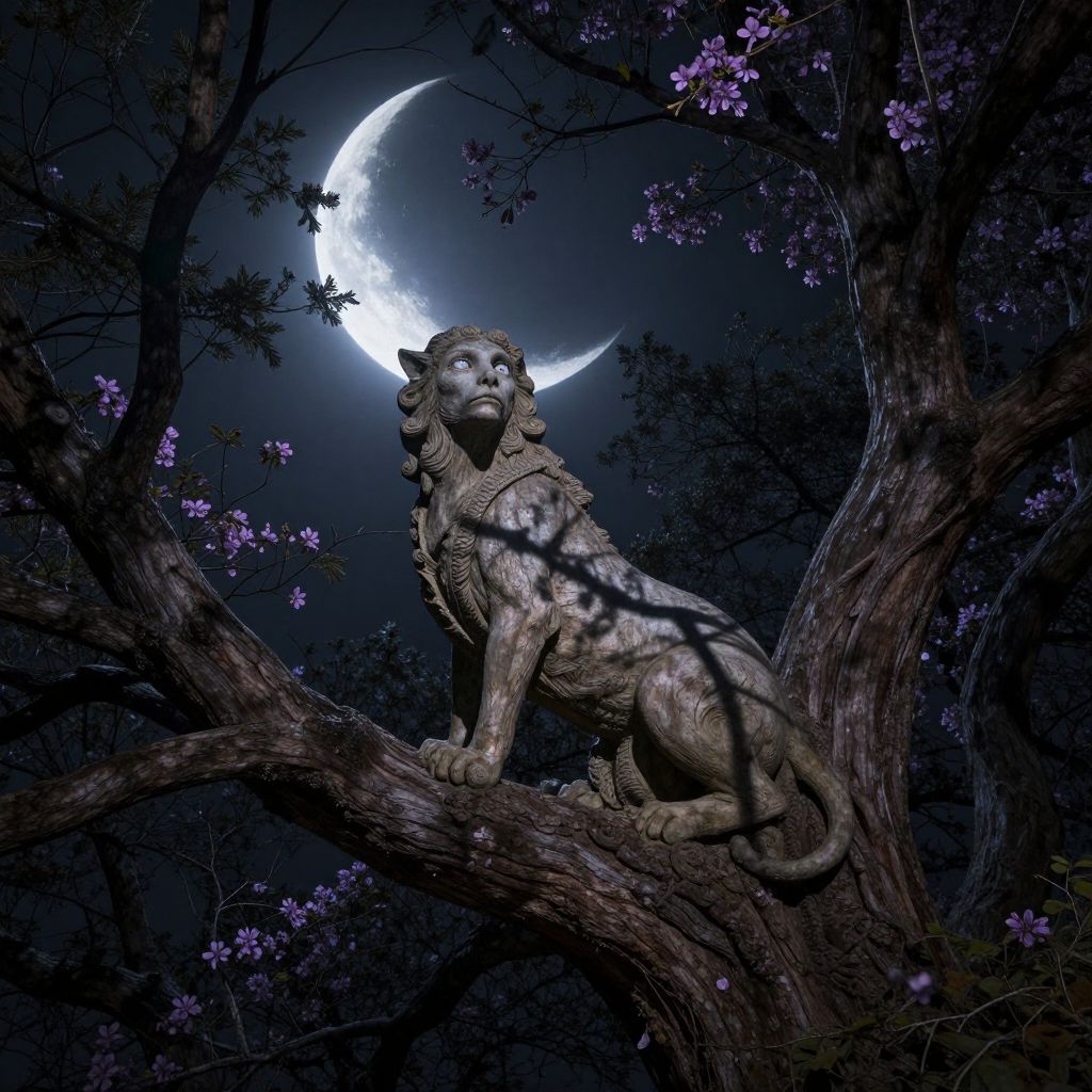 Photograph of a stone lion statue on a dark tree branch, illuminated by a crescent moon, surrounded by purple flowers.