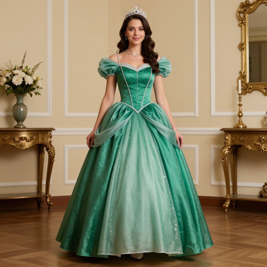 Green Princess Dress Costume, a woman in a green dress standing in a room