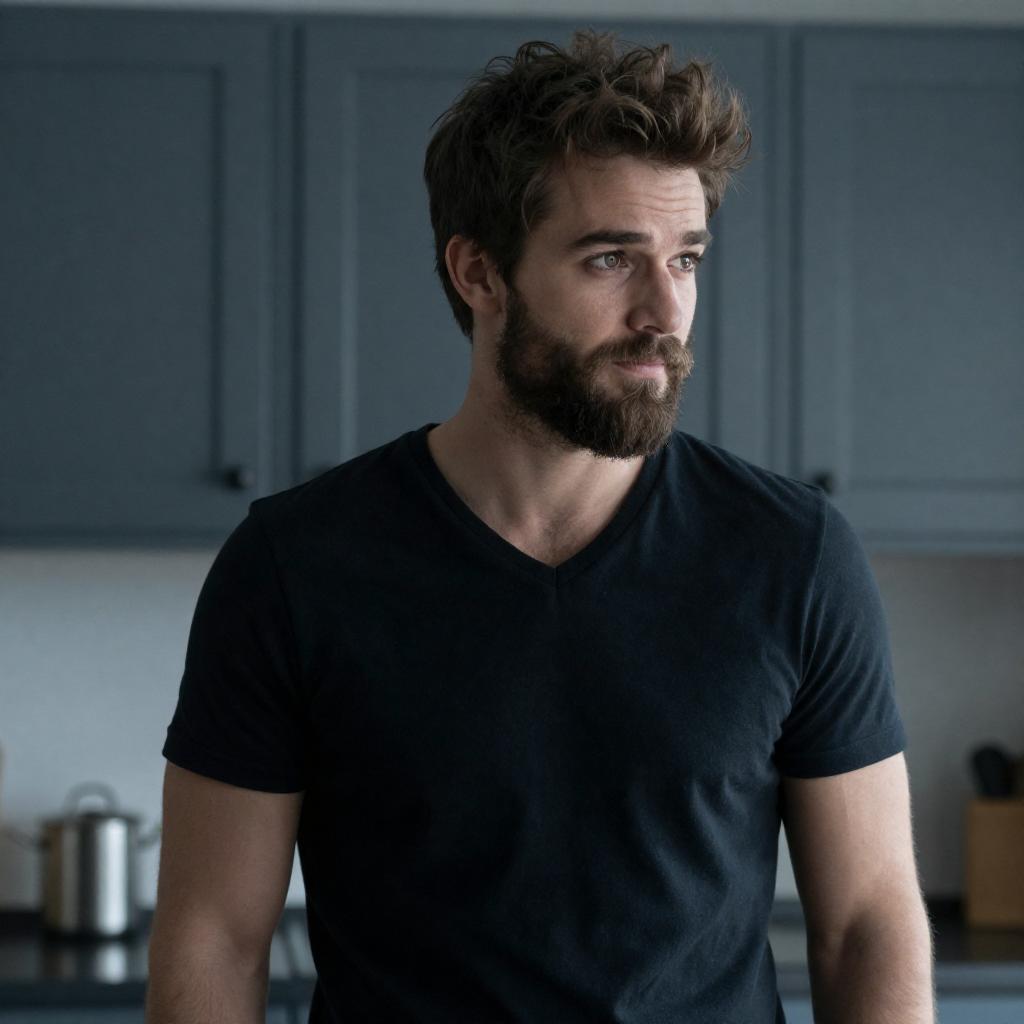 Photograph of a handsome, bearded man with light brown hair, wearing a black blazer over a white dress shirt, holding a glass of wine in his right hand. He stands in a brightly lit room with blurred figures in the background. His expression is serious and focused.