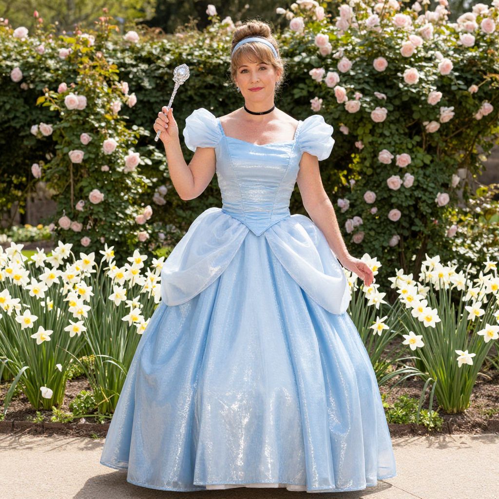 A realistic fashion-style shot of a middle-aged woman in a vibrant, full-length Disney Cinderella dress costume, standing in a fairy-tale garden covered in blooming roses and daffodils, the dress shimmering in the summer sun, her face serene and elegant with a gently lifted brow, holding a small silver wand in one hand and looking directly at the camera with a touch of nostalgia.. The woman has big breasts and cute face