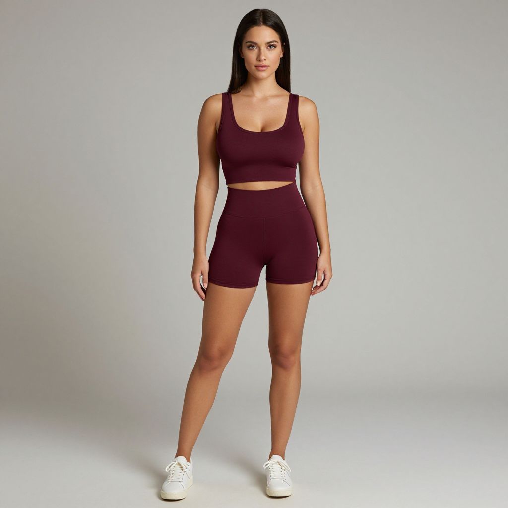"Woman, athleisure, coordinated crop top and shorts in maroon, scoop neck, sleeveless, high-waisted biker shorts, white lace-up sneakers, simple straight hair, plain studio background.. Sexy. Pretty face and beаutiful eyes. Big breasts."