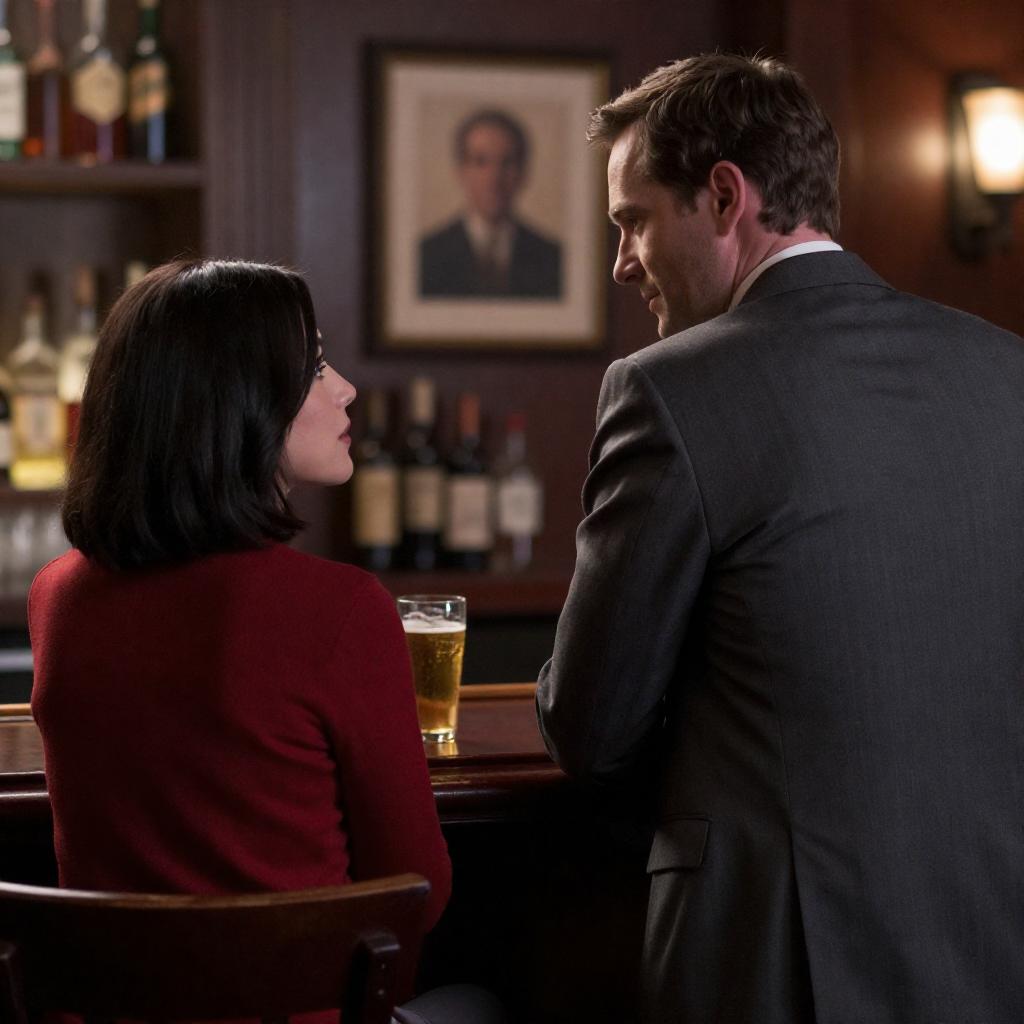Photograph of a dimly lit bar scene from "Final Chapter Walking Tall." A man with short brown hair, wearing a gray suit, stands facing a woman with short black hair, wearing a red top, seated at the bar. Background includes blurred bar shelves with bottles and a framed portrait. A glass of beer is on the bar in front of them.