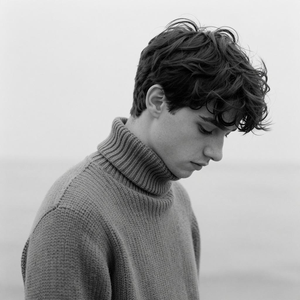 Black and white photograph of a young man with short, slicked-back hair, wearing a white shirt, smoking a cigarette. He rests his head on his right hand, elbows on a wooden table. Background is blurred with light filtering through a window. He has a serious expression.
