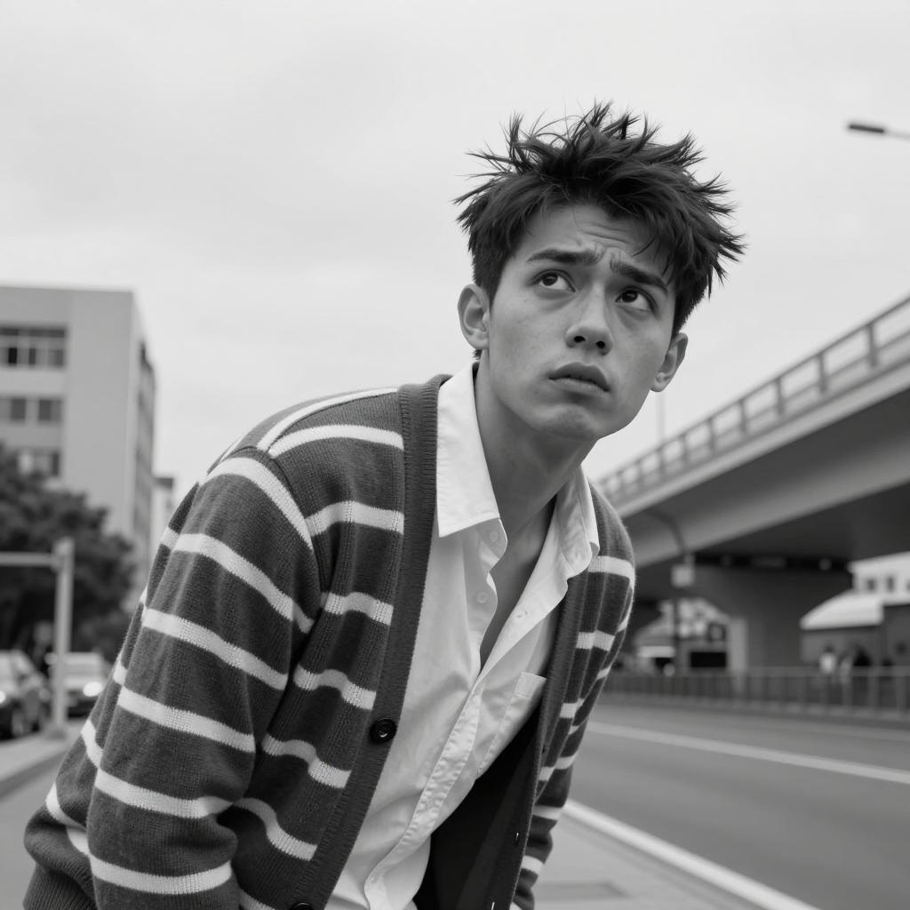 Black and white portrait of a young man with short, slicked-back hair and light skin, wearing a white shirt with rolled-up sleeves. He is seated at a wooden table, resting his head on his right hand while holding a cigarette in his mouth. The background is softly blurred with natural light coming through a window, creating a somber and contemplative mood.