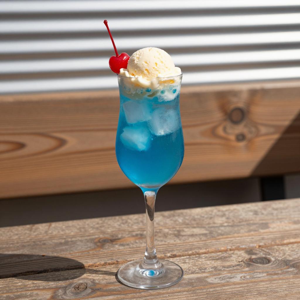 Photograph of a blue cocktail in a clear glass goblet with ice cubes. A yellow scoop of ice cream and a red cherry are on top. The goblet stands on a wooden surface with a blurred green outdoor background.