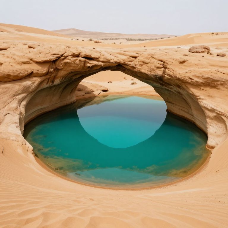 Photograph of a natural desert oasis featuring a large, circular underground waterhole. The image captures a smooth, tan-colored, sandy rock formation with an arched opening leading to a vibrant, turquoise-blue pool of water. The water's surface reflects a clear, blue sky. The sandy texture of the rock contrasts with the smooth, glass-like appearance of the water. The background includes more desert sand and a faint, white sky. The overall composition emphasizes the striking contrast between the arid desert and the refreshing oasis.