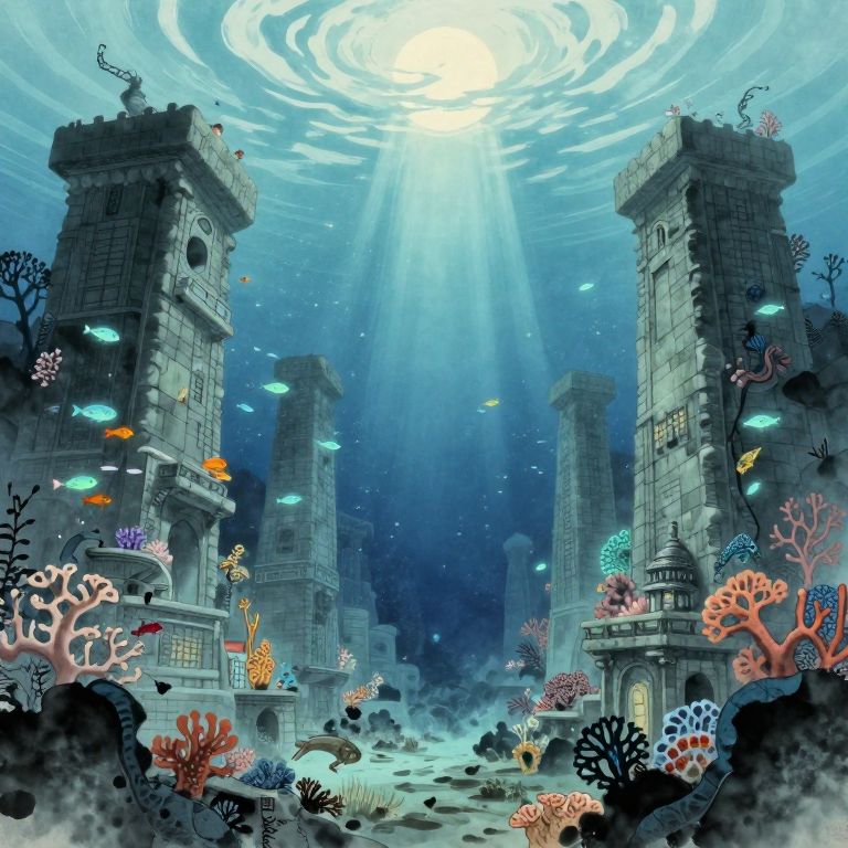 Craft an image that intertwines the dreamlike landscapes of a surrealist master with the meticulous pen-and-ink precision of a Renaissance genius. Depict an enigmatic cityscape rising from the abyss of a vast ocean, captured through an underwater lens. Focus on the architectural wonders merging seamlessly with coral reefs and marine life. A captivating palette of teal, turquoise, and indigo envelops this otherworldly metropolis, while fine pen strokes and dramatic shading bring forth intricate details and surreal elements. This fusion of styles invites viewers to embark on a journey of discovery through this mysterious underwater realm, uncovering hidden treasures and fantastical creatures along the way.