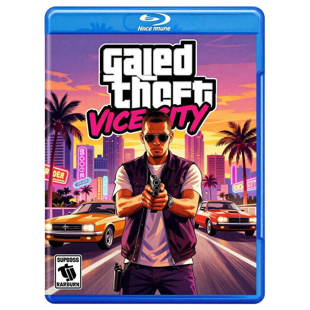 GTA Vice City box art with bold comic book style, showcasing a cool protagonist in sunglasses holding a gun, against a backdrop of Miami skyline at sunset, glowing neon signs, fast cars, and palm trees, saturated colors and dramatic shadows.