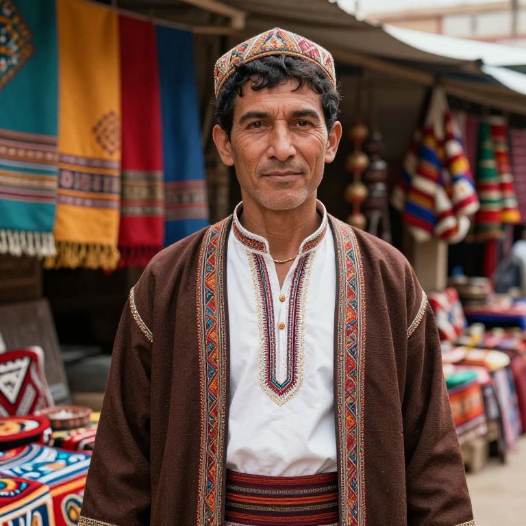 Photograph of a middle-aged man with olive skin and dark curly hair, wearing traditional clothing. He has a white shirt with intricate red and blue embroidery, a brown jacket with similar patterns, and a colorful, patterned cap. He stands in front of a market stall adorned with vibrant, multicolored textiles, including a yellow, blue, and red blanket, and various hanging items. His expression is calm and slightly smiling. The background is slightly blurred, emphasizing the man's detailed attire and the rich, colorful textiles surrounding him. The market setting is outdoor with natural light.
